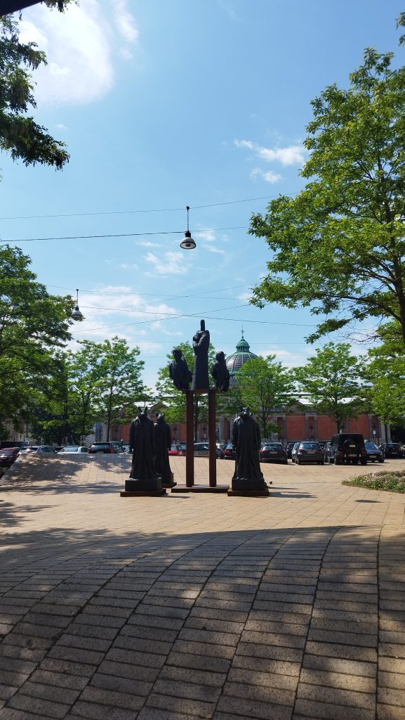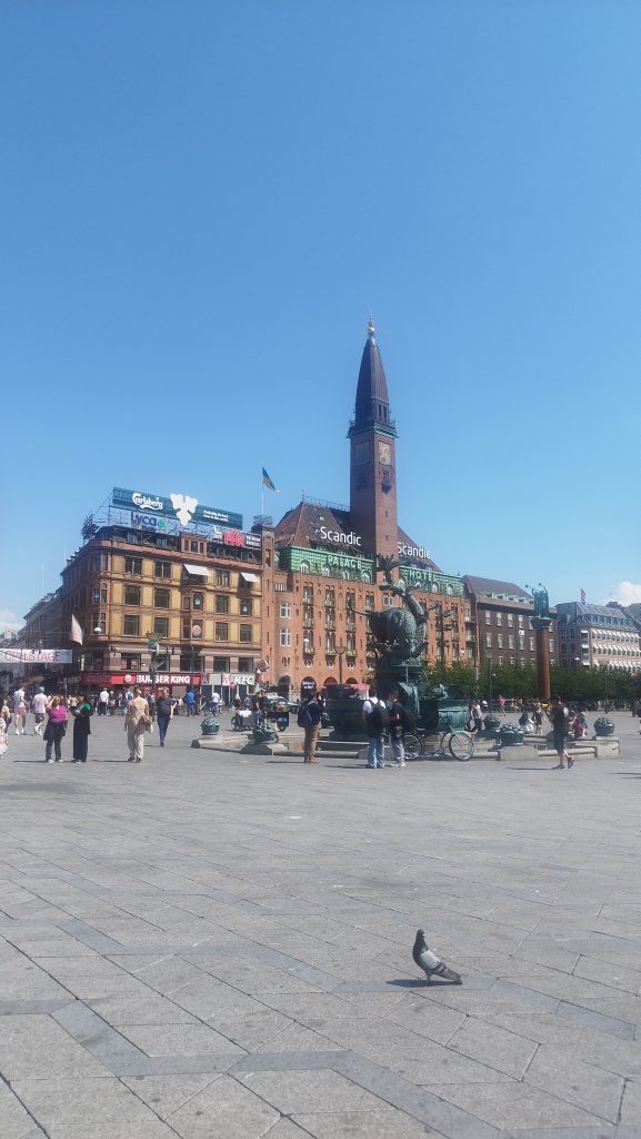 Mieliśmy mały problem z parkingiem, bo dalej nie rozumiem jak się je opłaca. Wiem tyle, że parkujcie na obrzeżach, tam jest albo za darmo albo najtaniej, w centrum ok. 24 koron duńskich za godzinę. Postawiliśmy więc gdzieś przy głównej drodze, niedaleko Christiani. Jest to częściowo samostanowiące się osiedle w dzielnicy Kopenhagi Christianshavn. Można tam zapalić skręta czy zrobić sobie zdjęcie z wielkim zielonym ogrem na tle barwnych graffiti. Stamtąd spacerkiem na Circle Bridge, z którego rozciągała się piękna panorama na wyspę zamkową i bibliotekę. Planowaliśmy zwiedzić ogrody zamkowe, ale upał pokrzyżował nam plany, było ponad 30 stopni. Prosto z Circle Bridge poszliśmy zobaczyć pomnik Andersena. Zatrzymaliśmy się po drodze na piwko i lody. Przypadkiem odkryliśmy pomnik ku czci Dantego Alighieri na Dantes Plads. Dość osobliwa sztuka. Krocząc wzdłuż Ogrodów Tivioli, najstarszego parku rozrywki w Kopenhadze, zrobiliśmy sobie zdjęcia z pomnikiem Hansa Christiana Andersena. Tego Pana raczej nikomu nie trzeba przedstawiać. Jeśli tak… to nie wiem gdzie wy żyliście… pod kamieniem?