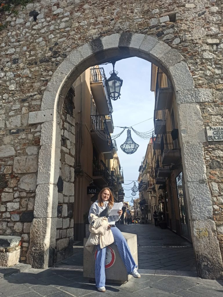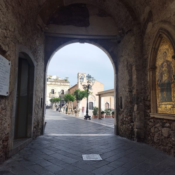 Naszą wycieczkę rozpoczęliśmy od parkingu, który znalazłam planując zwiedzanie- dobra cena, dużo miejsca i dobre położenie tuż przy starym mieście (Parcheggio Porta Catania). Pierwszym punktem wycieczki była brama miejska Porta Catania wzniesiona w 1440 r, stanowiąca początek głównej ulicy starego miasta, która była częścią fortyfikacji obronnej. Przechodząc przez nią, docieramy do innego świata- świata wąskich uliczek, kolorowych ceramicznych ozdób, ceglanych kamienic i zielonych roślin. Od razu czuć klimat tego urokliwego miasta.