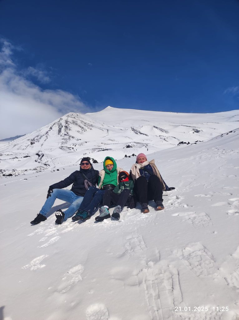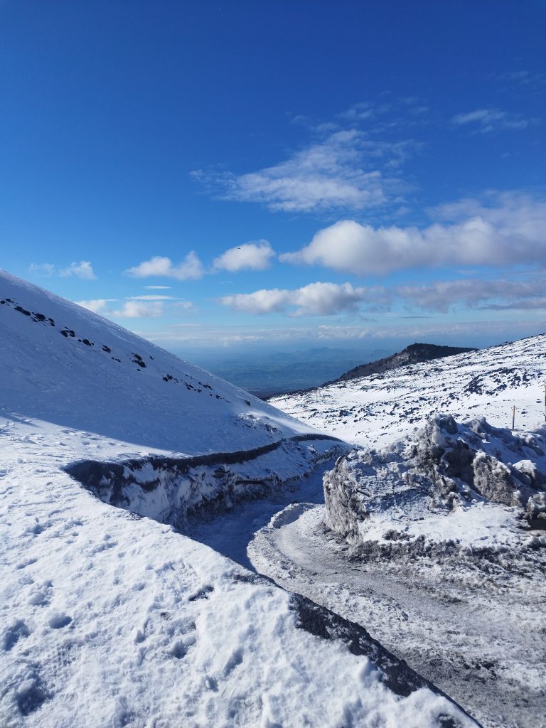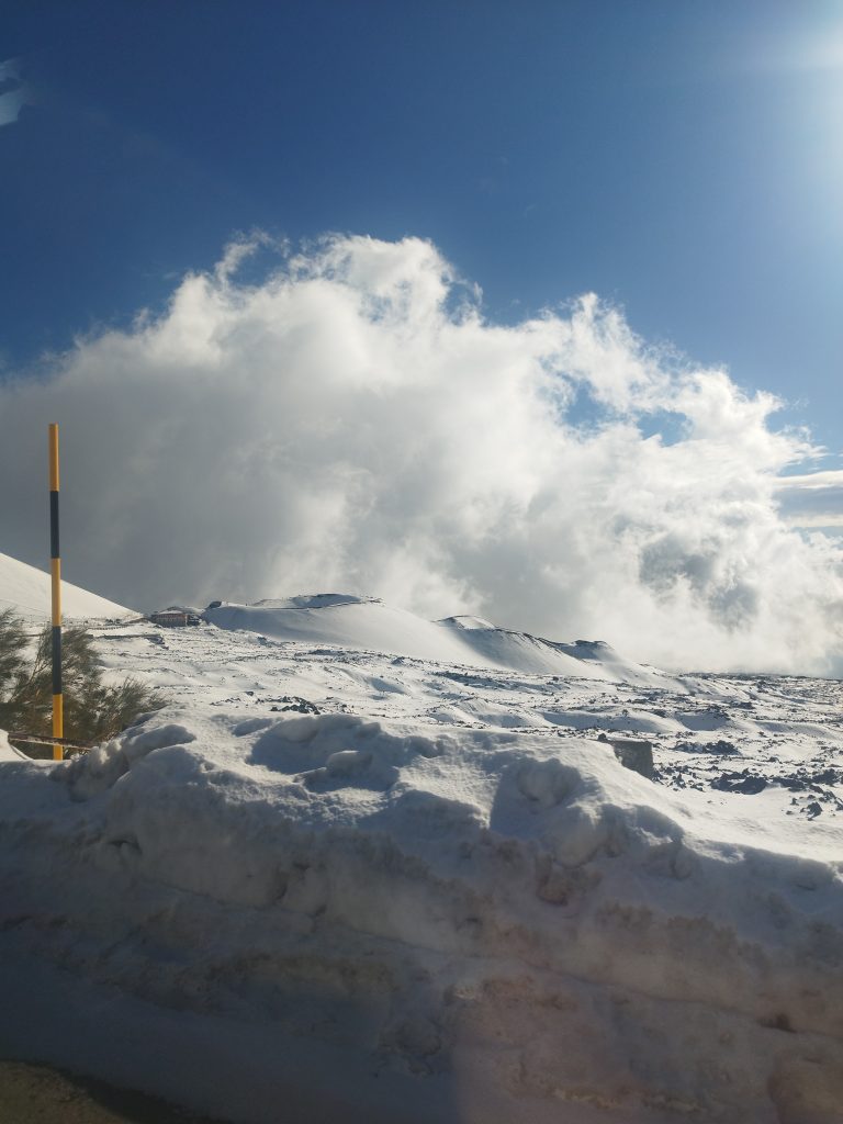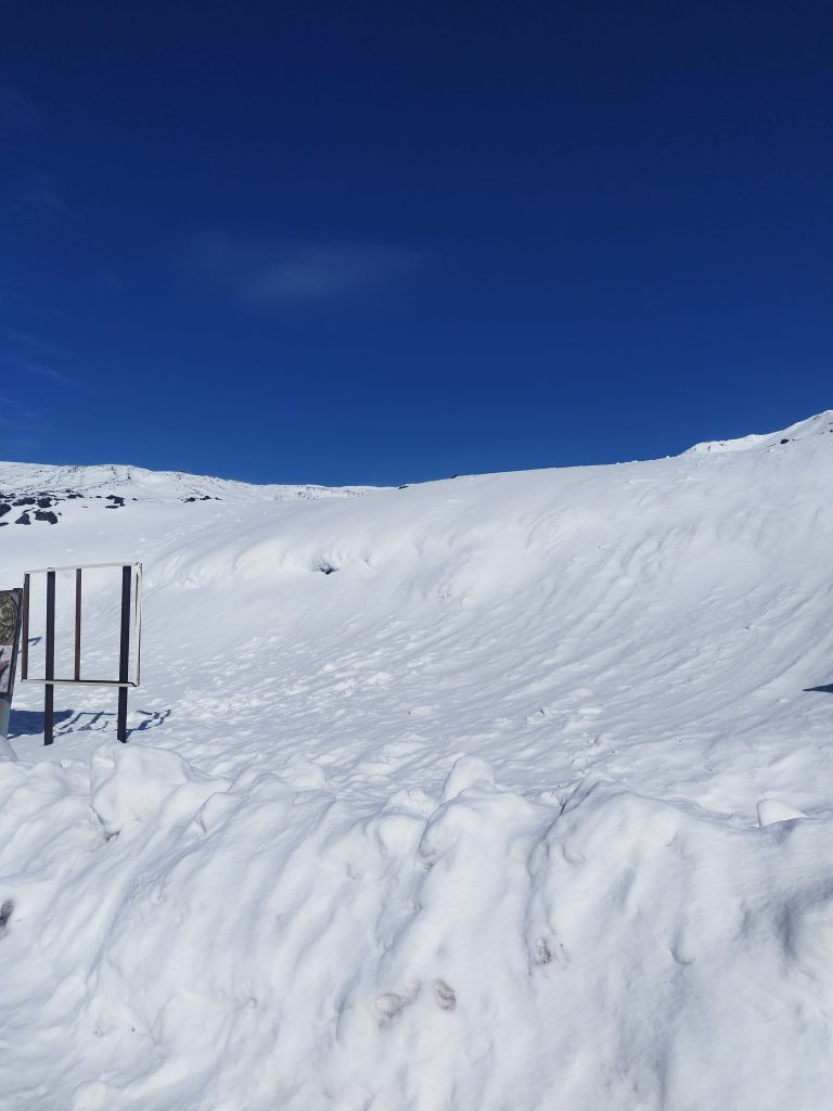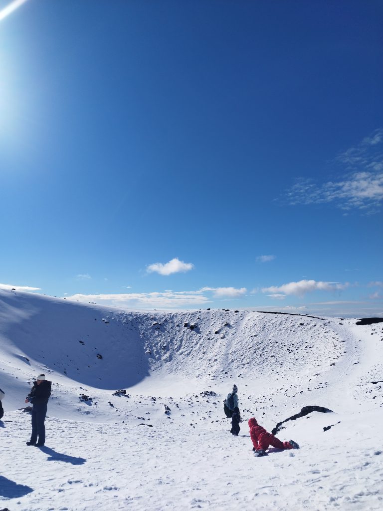 Śnieg? Na aktywnym wulkanie? Też tak myślałam, ale dowiedziałam się, że z powodu wysokości wulkanu na tych wysokich partiach jest niska temperatura przez co, utrzymuje się tam śnieg. Ubraliśmy się grubo- termiczna, czapki, szaliki i rękawiczki. To było bardzo rozsądne posunięcie. Śniegu było tyle, że w życiu tyle nie widziałam. Z tego, co mówiła przewodniczka ok 2m.