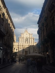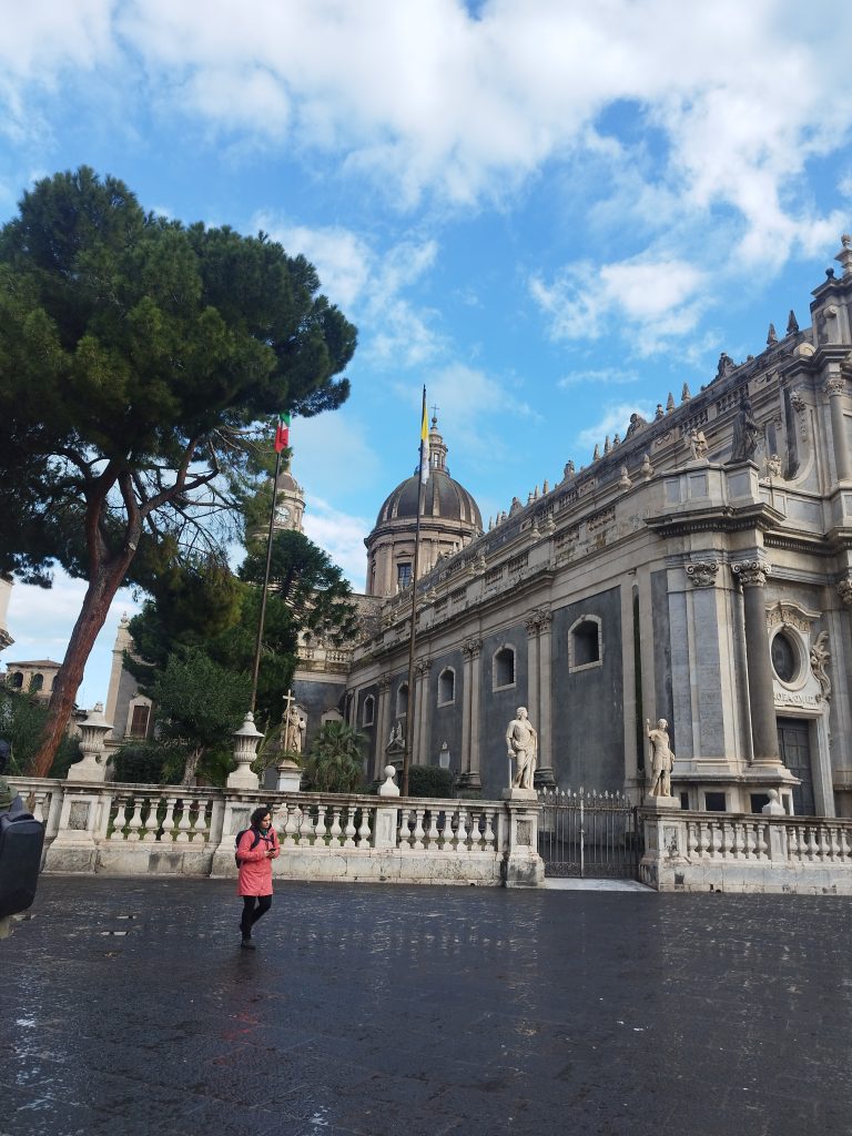 Pierwszą atrakcją spaceru była barokowa fontanna z herbem miasta – Fontanna dell’Amenano. Stoi ona w rogu placu Duomo, wyróżnia się białą fasadą i stoi nad płynącą pod miastem rzeką. Dalej wychodzimy na Piazza del Duomo, czyli plac katedralny, który jest jednym z głównych placów miasta. W jego centrum stoi fontanna z czarnym słoniem- Fontana dell’Elefante. Z pozoru jej elementy wydają się być przypadkowe, ale tak nie jest. Słonie, które można zobaczyć w wielu miejscach w Katanii, przypominają o żyjących dawniej na wyspie słoniach karłowatych. Zwierzę to zostało wykute w skale wulkanicznej, a na swoim grzbiecie niesie egipski obelisk z Asuanu. Zwrócony jest trąbą w stronę katedry świętej Agaty, która jest patronką miasta. Katedra Świętej Agaty (Basilica Cattedrale di Sant’Agata) to barokowa budowla powstała na miejscu XI-wiecznego kościoła, zniszczonego podczas trzęsienia ziemi.