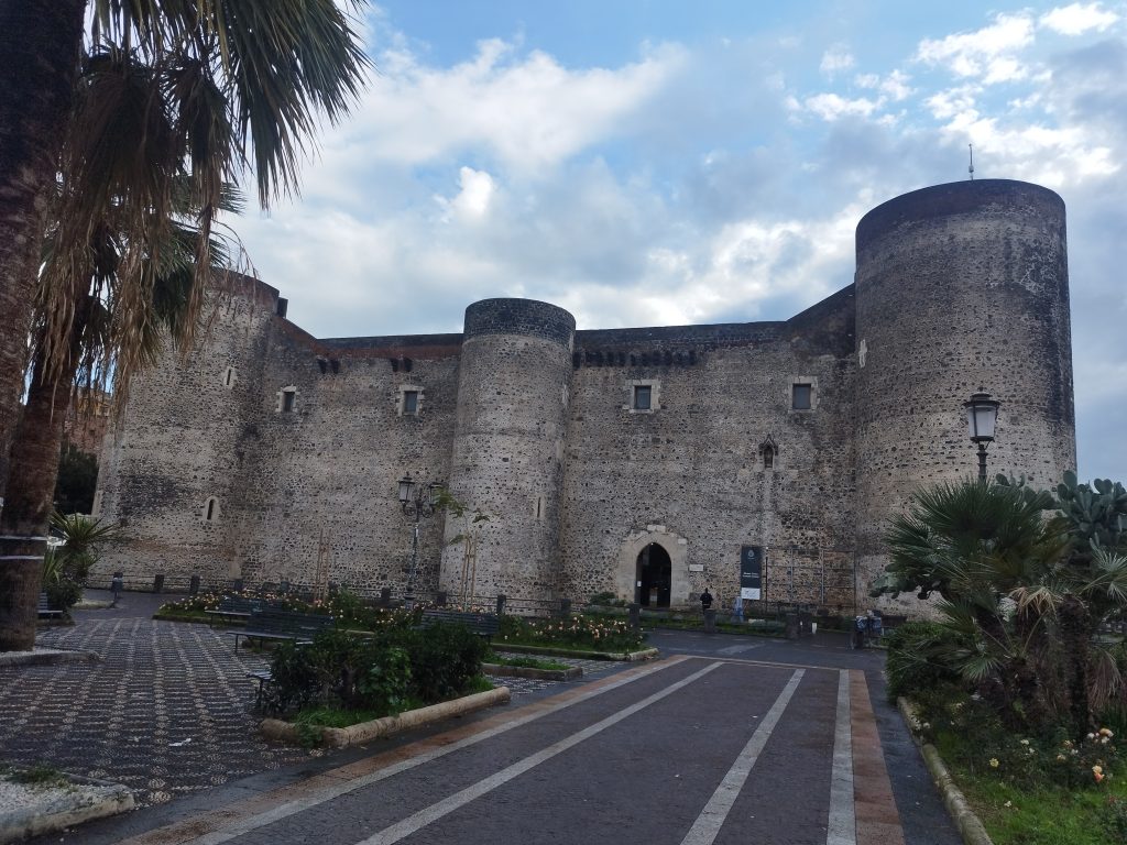 Warownia Castello Ursino wybudowana została między 1239 a 1250 i nazwana z łaciny Castrum Sinus- zamek w zatoce. Nad bramą, po prawej znajduje się orzeł z leżącym pod nim zającem. Jest symboliczna płaskorzeźba, gdyż, orzeł oznacza Fryderyka, którzy rządził wtedy miastem, a zając- Katanie. Tylko nie zgadza się jedno, gdzie urwisko? Gdzie zatoka? Zamek stoi na placu pośród kamienic, więc co poszło nie tak? Okazuje się, że podczas jednego z wybuchów Etna, lawa dopłynęła aż do Katanii. O dziwo nie zniszczyła ona zamku, a otoczyła go i popłynęła dalej, tym samym tworząc kolejne kilometry wybrzeża i podnosząc poziom gruntu o ok. 9 m. Przez to drugie piętro warowni stało się jej parterem. Z jednej strony zamku, zależy od której przyjdziecie widać jeszcze pozostałości- jęzory lawy (czarne skały wulkaniczne). Zamek z zewnątrz dalej pięknie się prezentuje, wygląda solidnie i pozwala poznać kawałek historii.