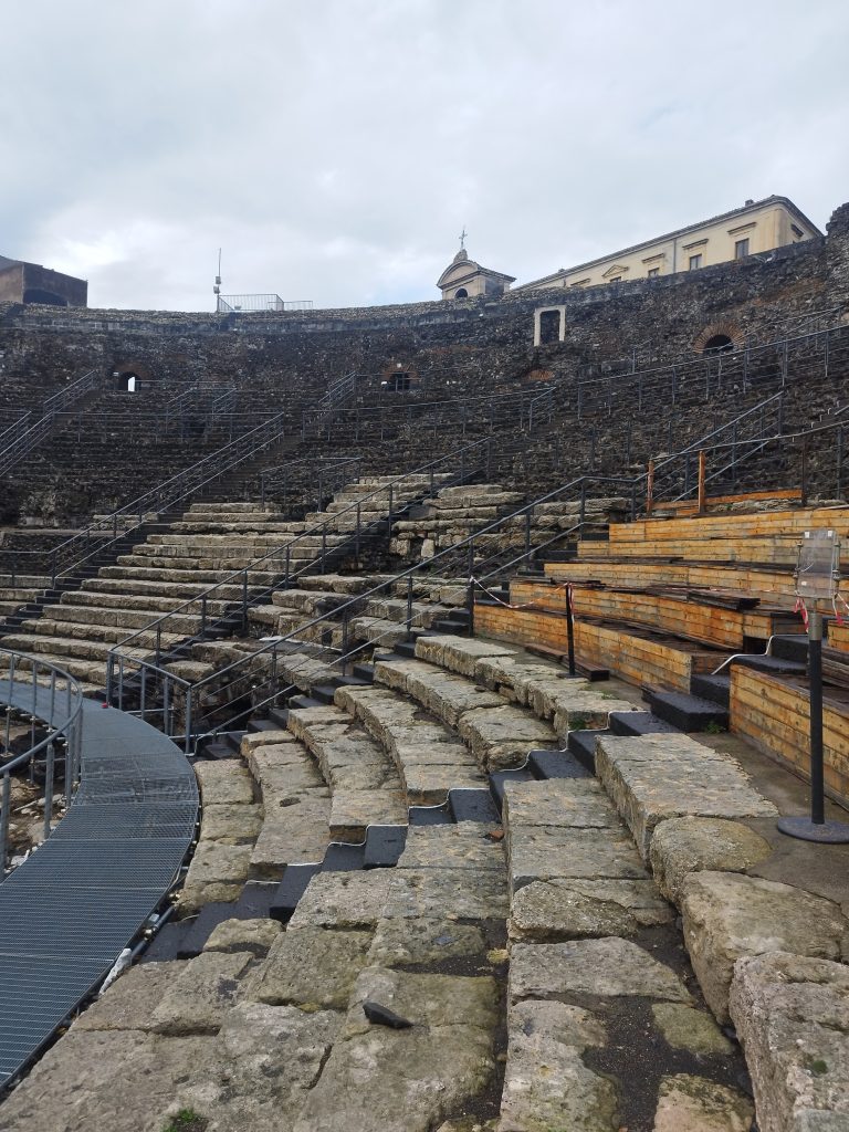 Zjedliśmy sobie przekąskę na ciepło crousanty z czekolada, serem i pistacjami, po czym udaliśmy się do miejsca na które najbardziej czekałam, czyli do teatru antycznego. Teatro Antico Greco-romano di Catania to ruiny wzniesionego w II w n.e teatru rzymskiego, który został odkopany dopiero w XIX w. Przylega do niego mniejszy teatru Odeon, który zachował się zdecydowanie gorzej. Najdziwniejsze jest to, że te obiekty historyczne znajdują się pośród kamienic mieszkalnych.