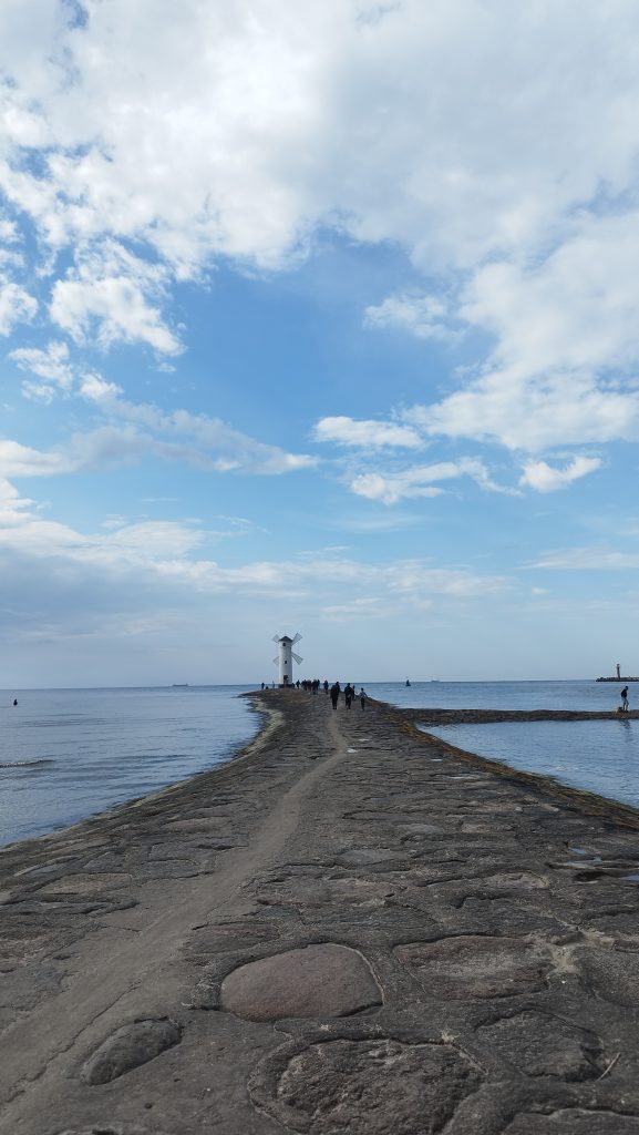 Obowiązkowym punktem jest Stawa Młyny, jest to stawa (znak nawigacyjny) w kształcie wiatraka wybudowana w 1874 roku, która szybko stała się symbolem miasta i popularnym miejscem zdjęć. To był nasz pierwszy punkt spaceru. Plażą wzdłuż morza, ruszyliśmy w kierunku portu, tam na kamienistą ścieżkę i mogliśmy sobie robić zdjęcia przy Stawie. A jak wracaliśmy to dosłownie uciekaliśmy przed deszczem, który mimo naszych ogromnych starań, jednak nas złapał i doszczętnie zmoczył. Tego dnia wiele nie zobaczyliśmy, bo niestety się nie rozpogodziło, a dodatkowo byliśmy tak spieczeni po porannym „smażingu”, że nie mieliśmy już mocy.
